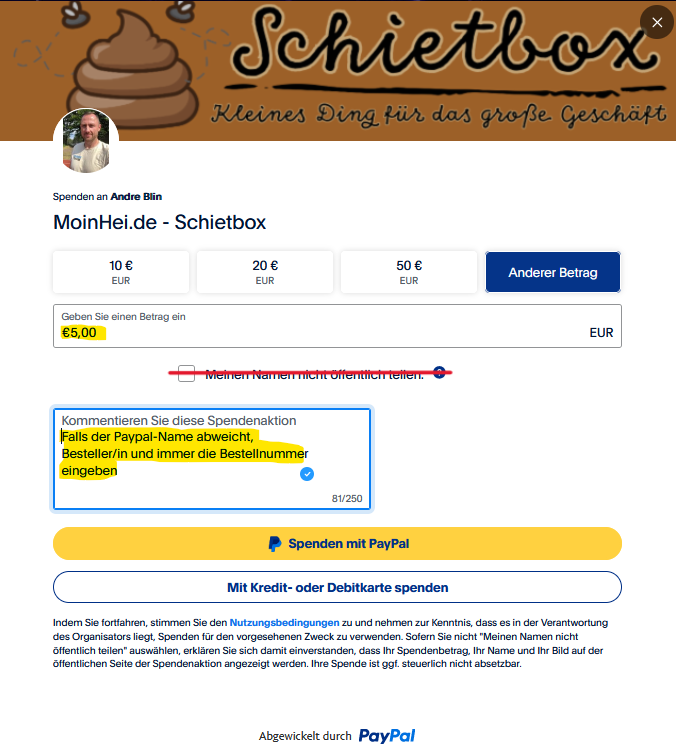 Die Abrechnung der Spenden erfolgt über Paypal. Die Schietbox 2.0 Aktion läuft noch bis zum 11.05.2024